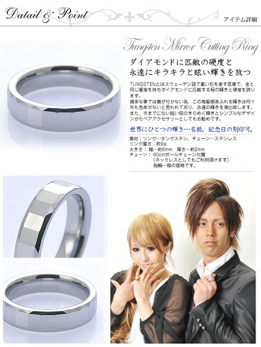 ■タングステンとは,スウェーデン語で重い石を表す言葉で、金と同じ重度を持ち,ダイヤに匹敵するほどの硬度を誇り,キラキラした鏡面の輝きを放ちます。